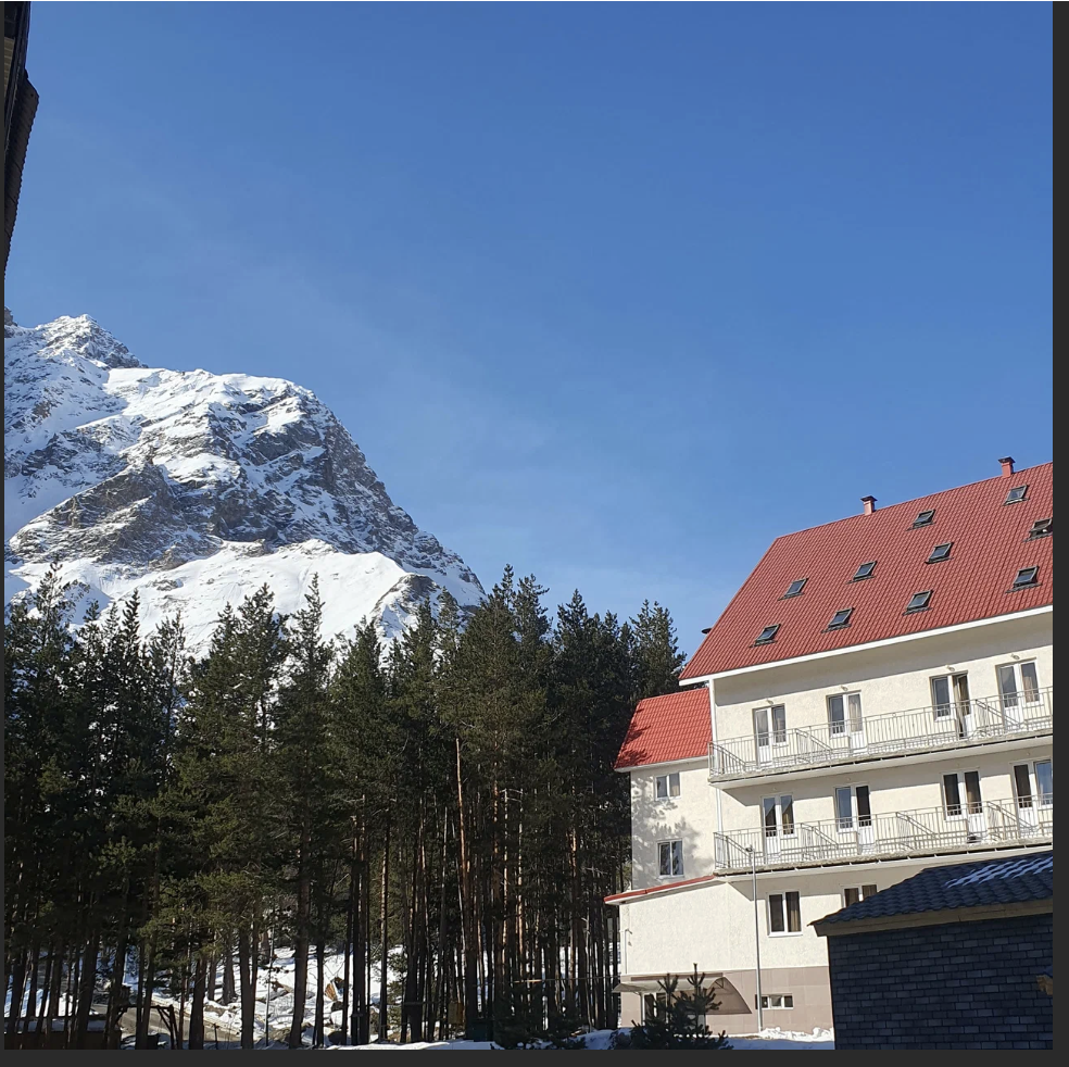 Живём на поляне Азау — в отеле с видом на горы, всего в 2 минутах от подъемников.